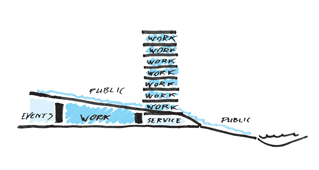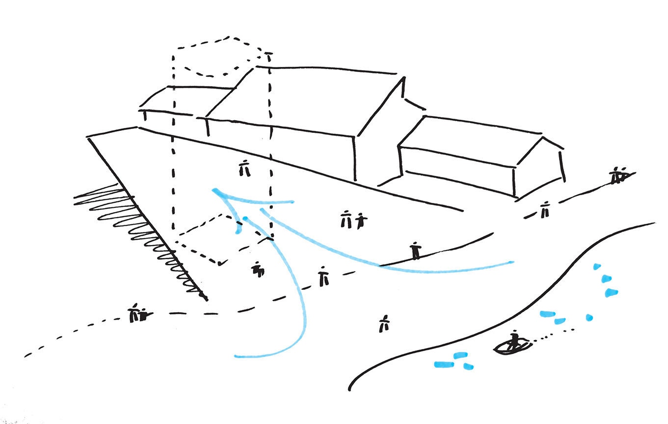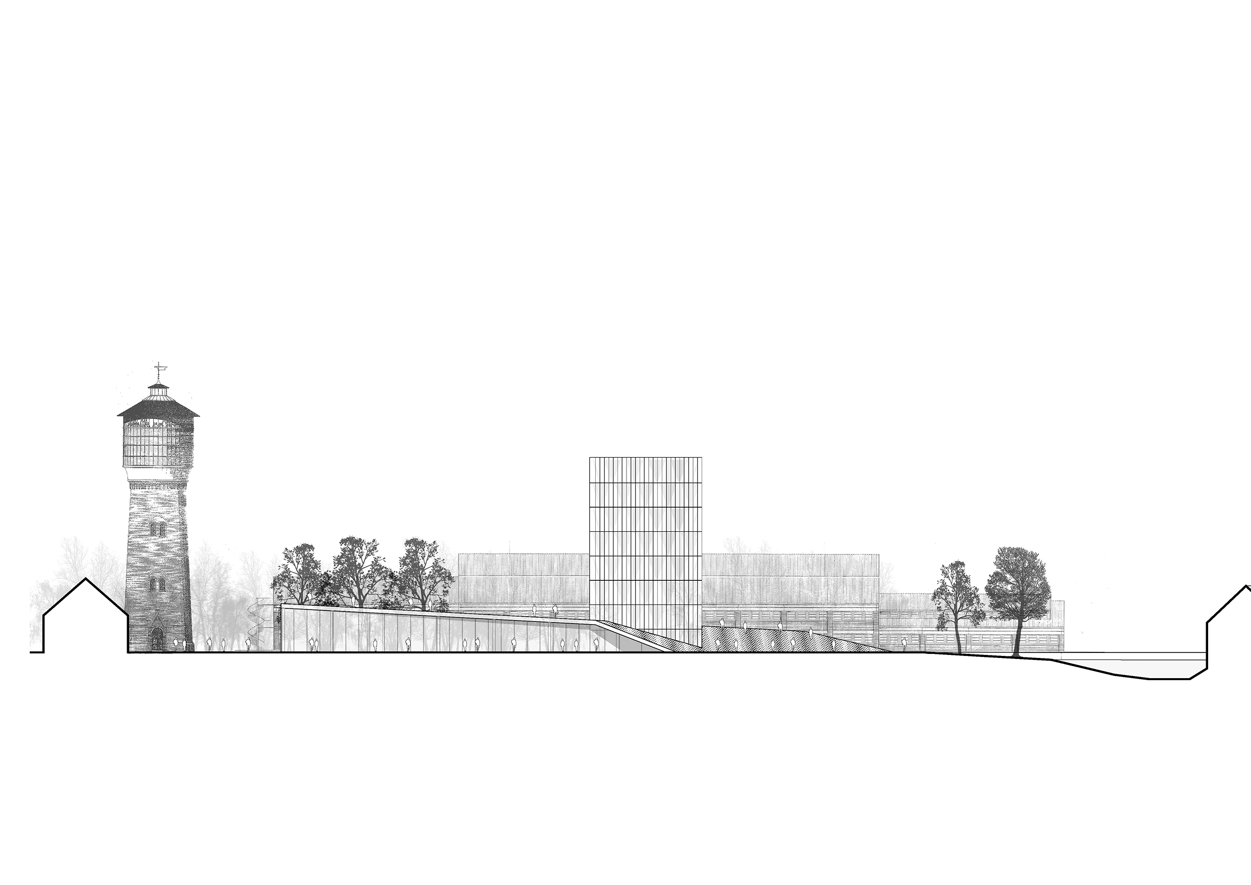 Architektai sklypo pietinėje pusėje suprojektavo naują objektą – bokštą, kuris atlieka ir vizualinio orientyro funkciją. Sklypo reljefas ryškiai žemėja, jo žemutinėje dalyje projektuojamas bokštas ir sukuriama įdomi kintančio reljefo aikštė aplinkui.
